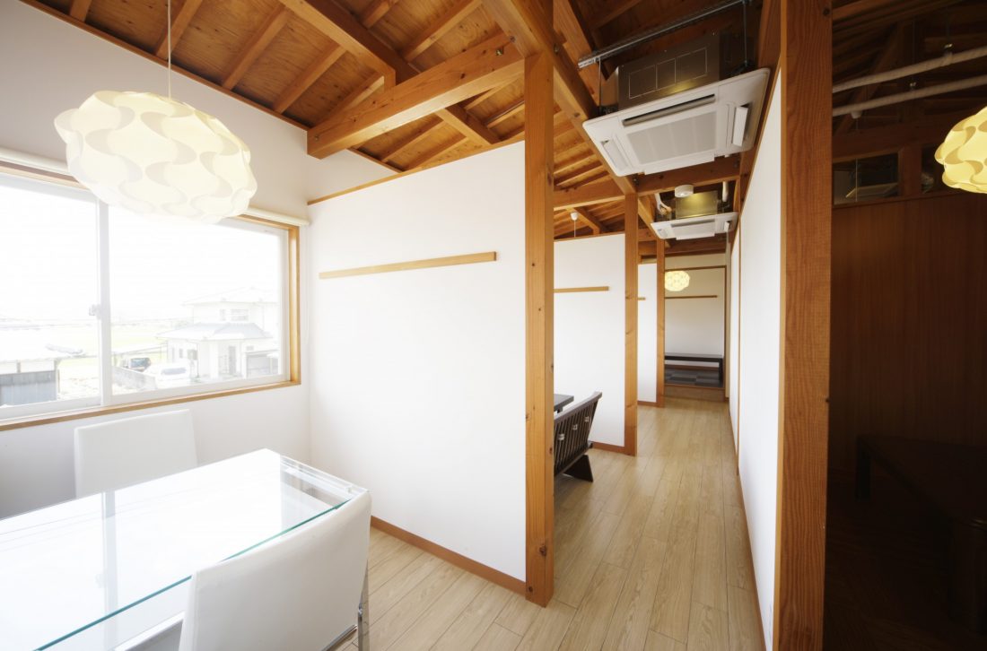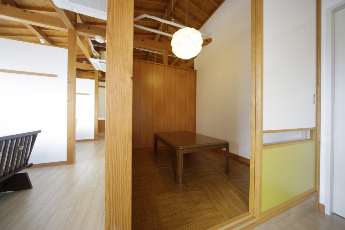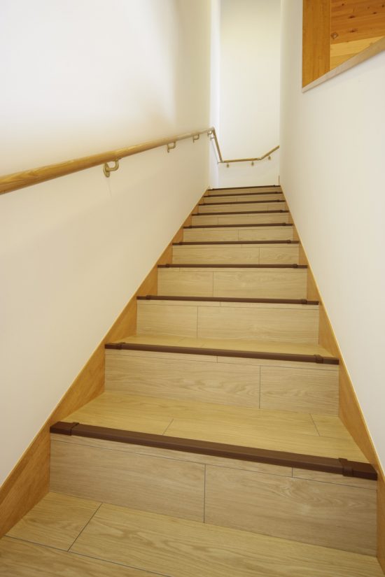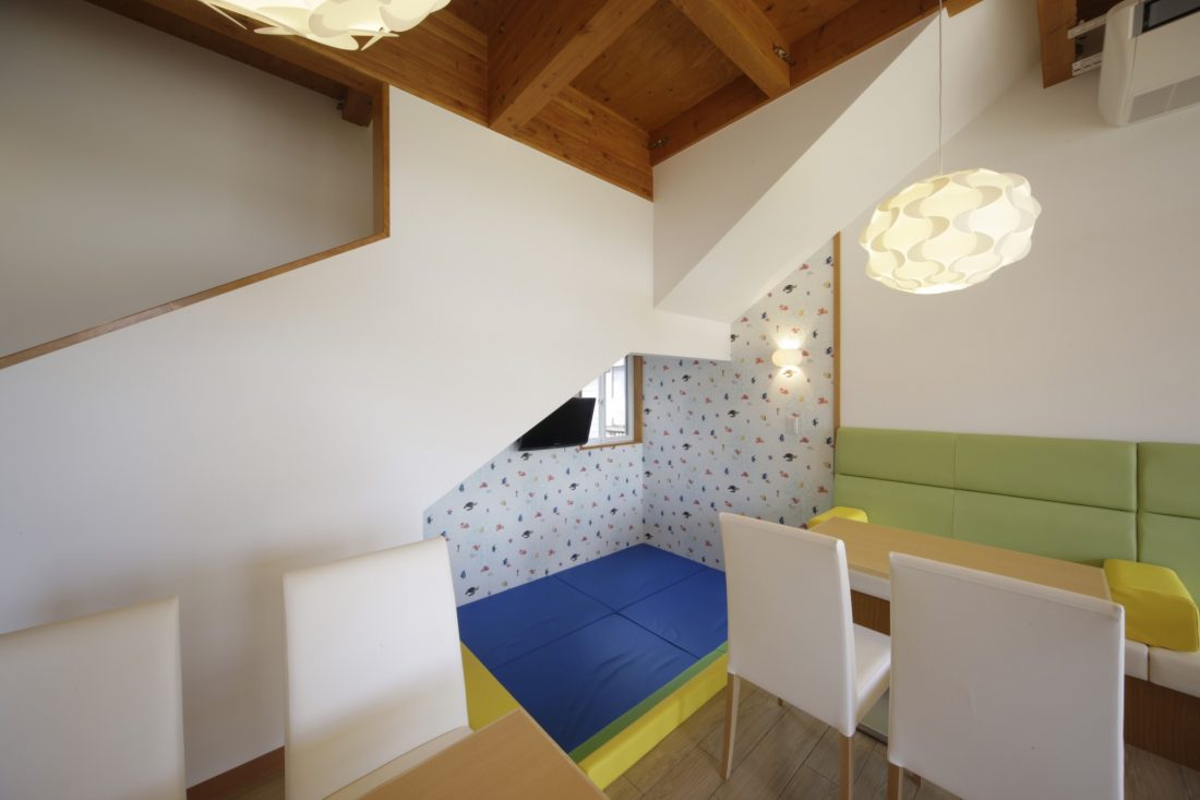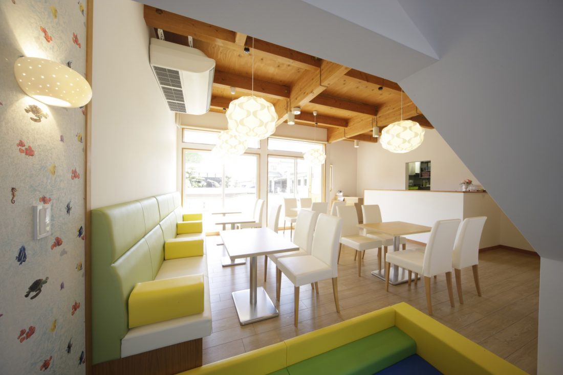 住宅団地内において、お子様連れのお母様方もご利用しやすいカフェの新築工事です。 奥行が広く、高さの低い階段とすることで、小さいお子様やお子様を抱いたお母様方もご利用しやすい設計といたしました。