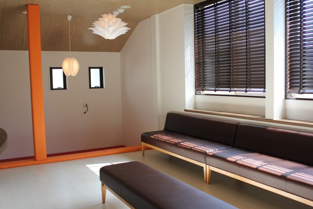 「小学校等がすぐ近くにあり、お子様の来院が多い事から小児専門歯科と思われがちで、本来はすべての年齢層の方に来ていただきたい。Cafeっぽい雰囲気にしてください。」とご依頼を受け、イメージの転換も含めて、シックで落ち着いた色合いと、子供も興味を持てるデザイン・柄、そしてキッズコーナーと待合室の連続性をポイントにいたしました。
