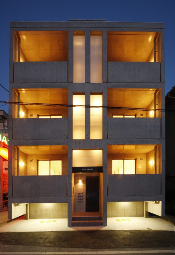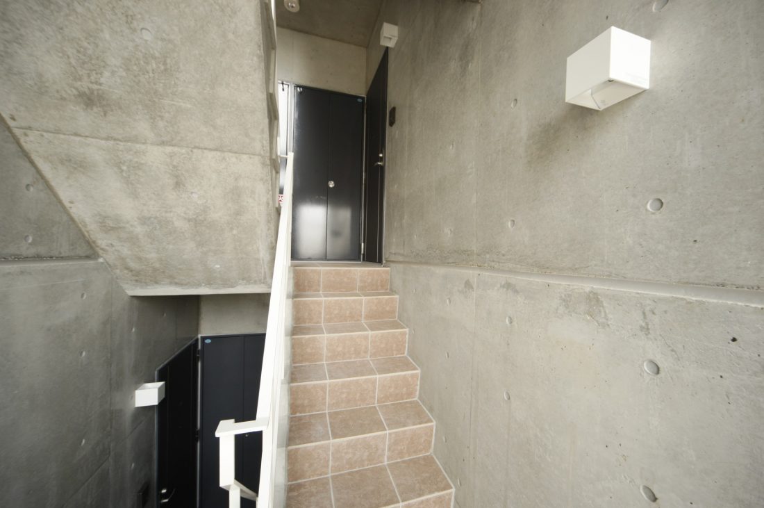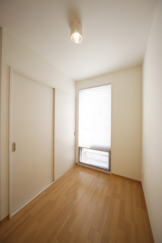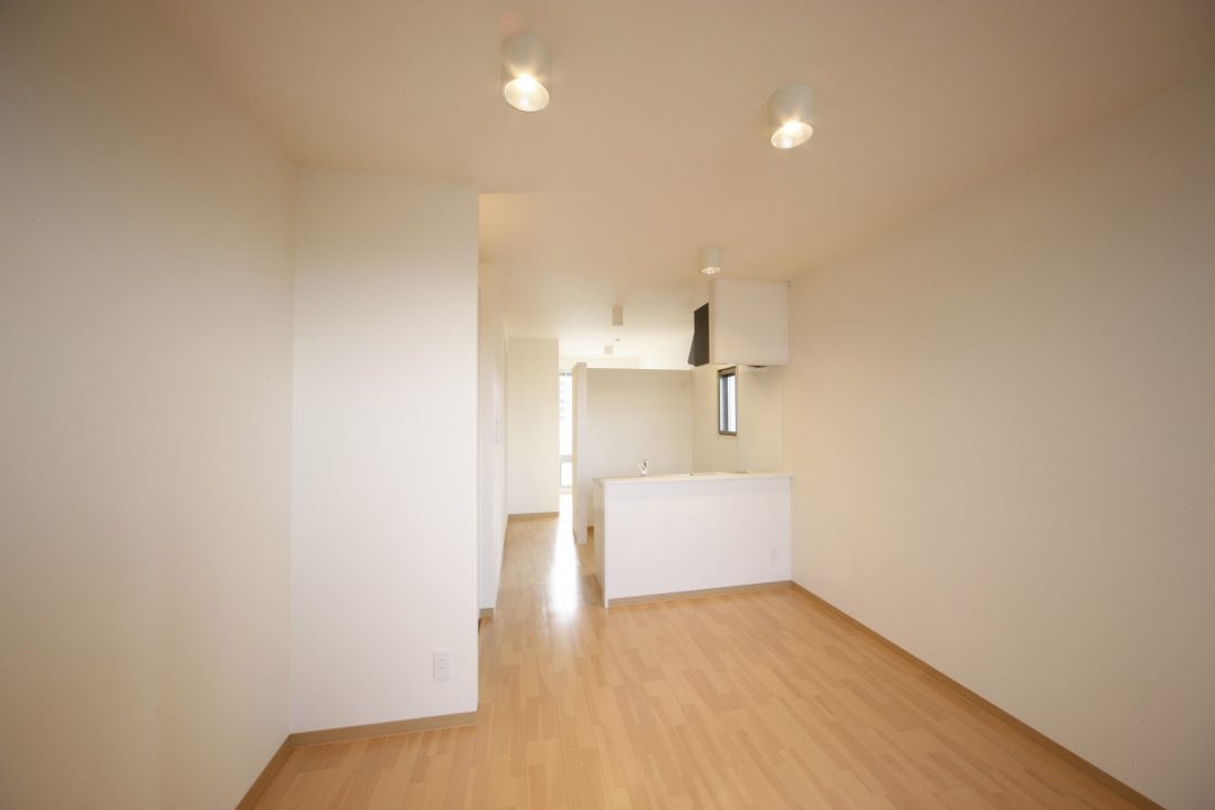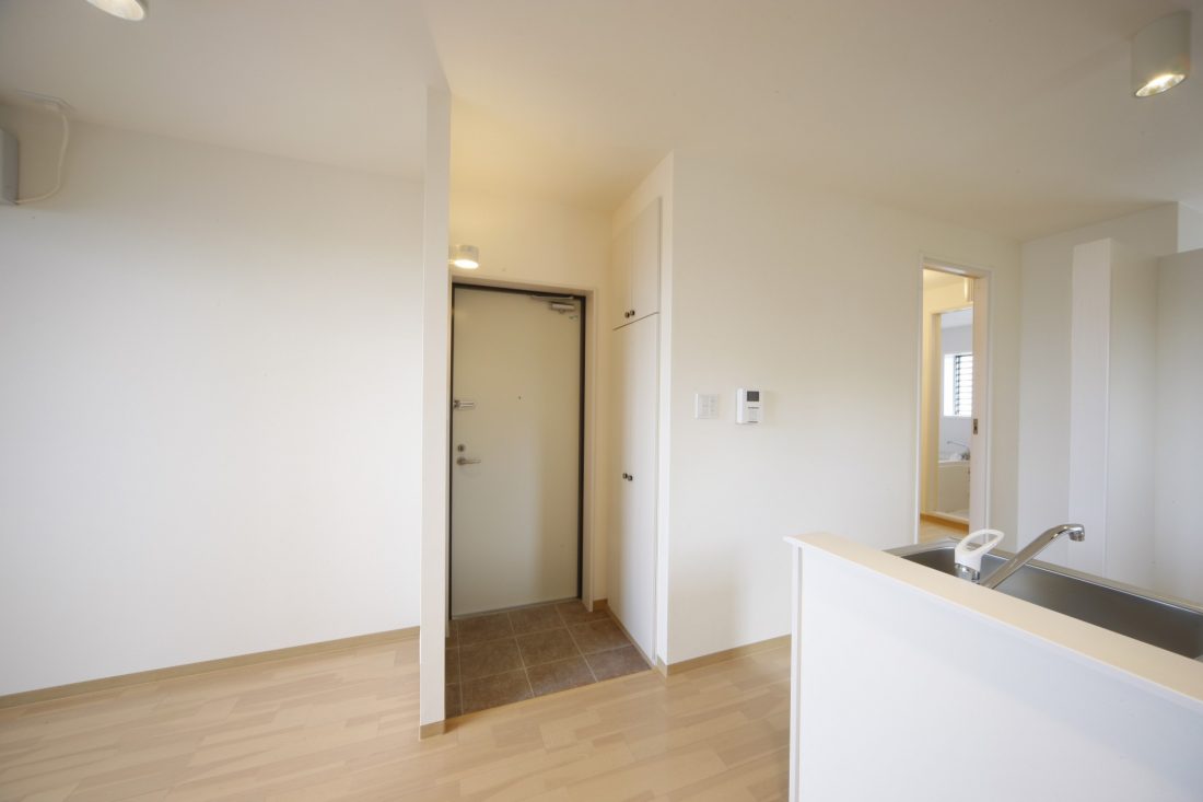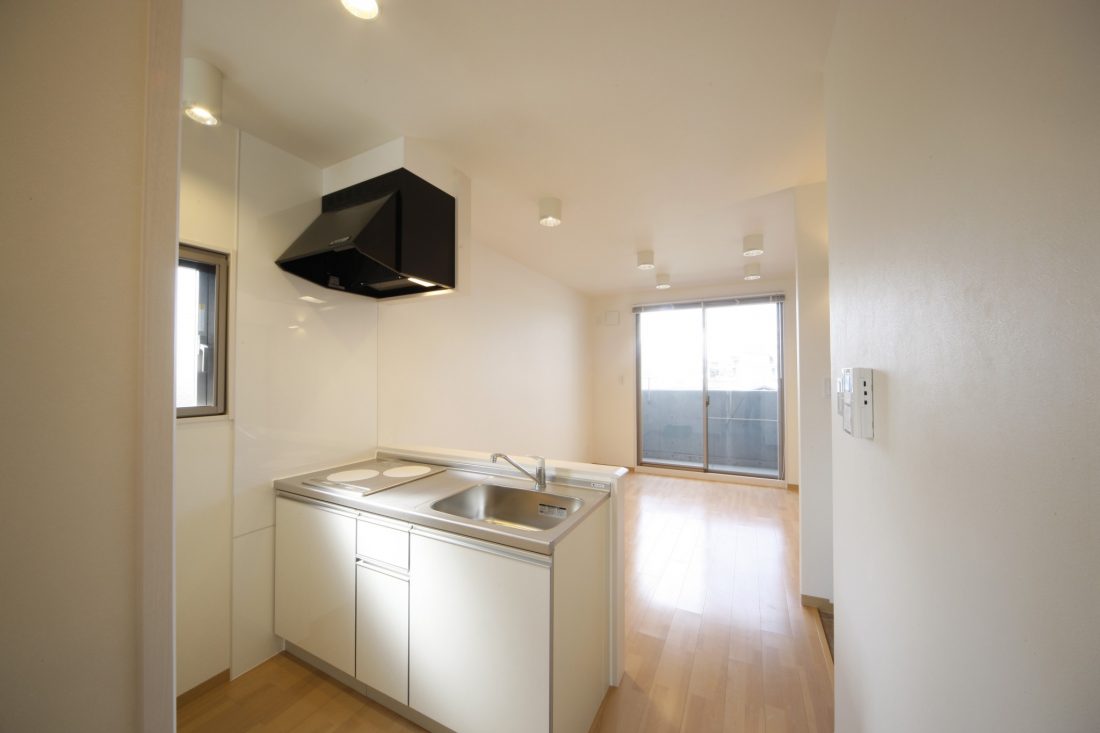 鉄筋コンクリート造3階建の1LDK賃貸マンションの新築工事です。 玄関の位置と、キッチンの設置場所を部屋の真ん中に配置する事で、ベッドルームとなるプライベート空間を作る事ができました。