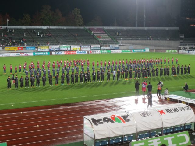 矢島選手が冷静に決めて1-0、その後キーパーの中林選手が相手選手と交錯、逆にPKをとられてしまうも場内一体となって「な・か・ば・や・し、な・か・ば・や・し」コールで見事PKを弾き返しホーム最終戦を勝利で飾りました。