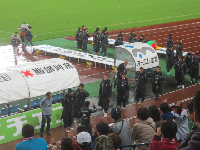 試合のほうは雨で思うように試合が進まず0-0のまま前半終了、後半コーナーキックからPKを獲得。