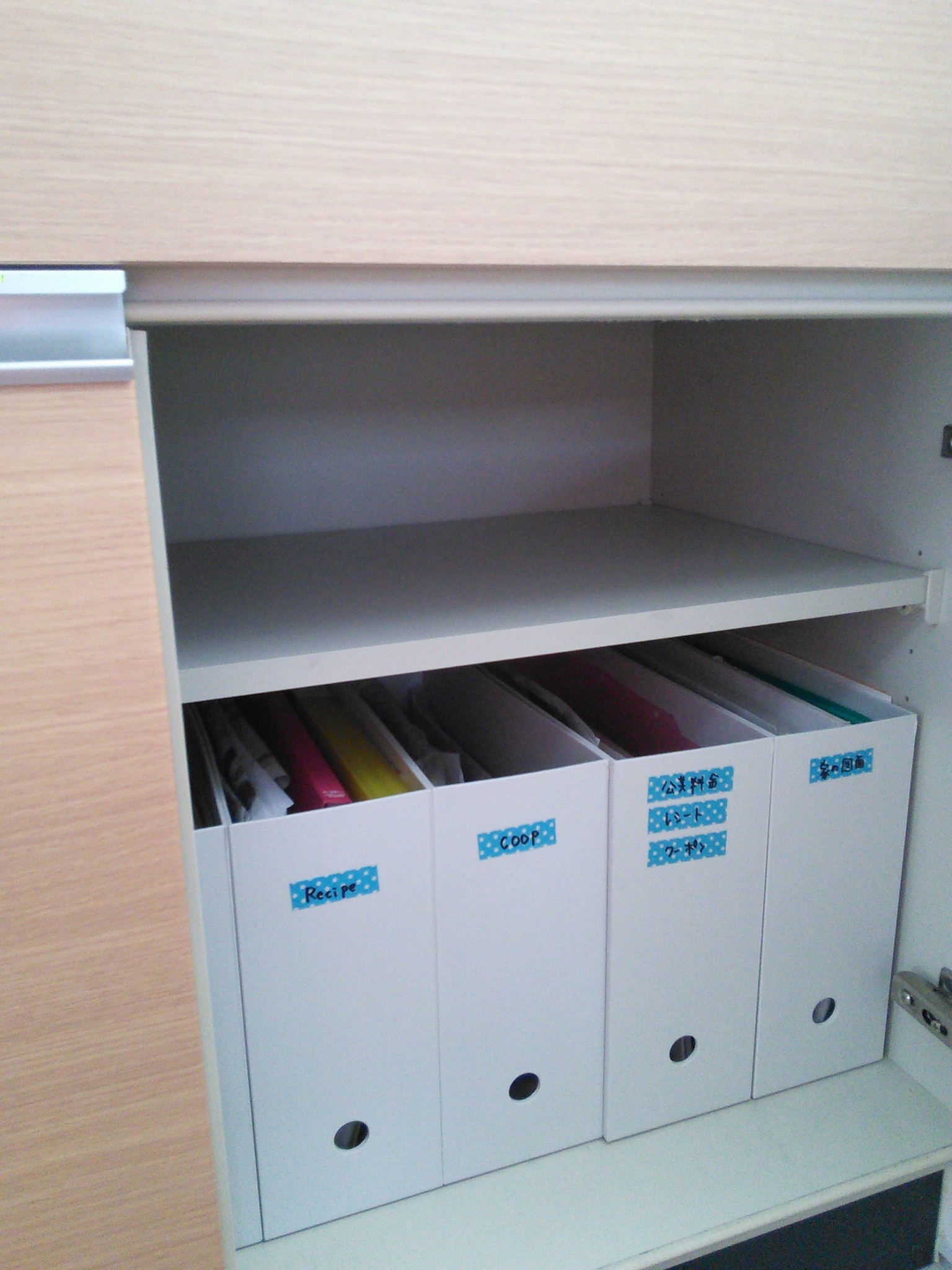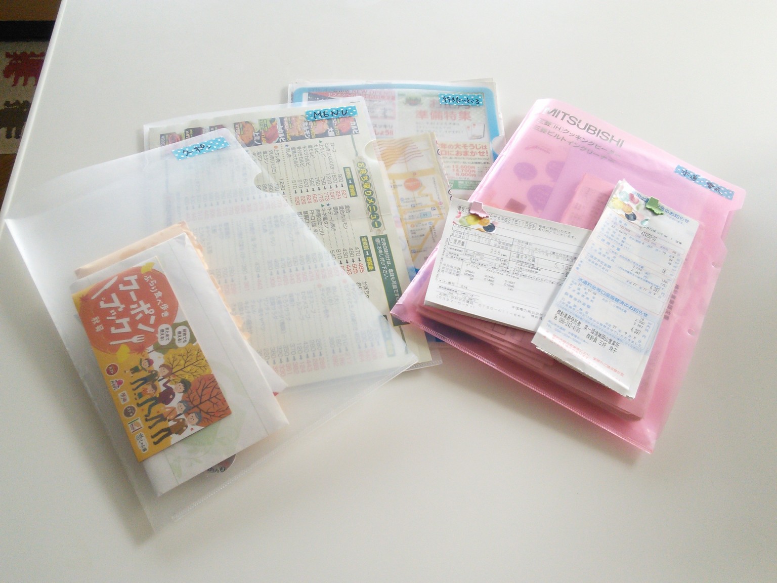 例えば、「公共料金」「出前とかのメニュー」「クーポン」「行ってみたいとこのチラシ」などなど分類して、こちらもきちんとラベルをつけて、入れておきます。ちなみに右端のピンクのファイルは「過去3年分の水道、ガス、電気の料金表」が入ってます。オール電化にしたので、過去と今の料金を比較したくて、取ってます。過去は年ごとにフォチキス止め、今年のはクリップ止めです。