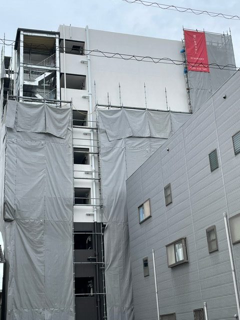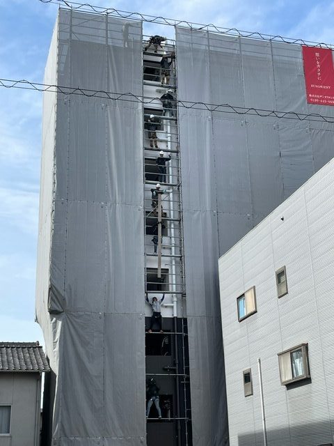 今日は朝から外部足場の解体です、内装工事は1階を残すのみで上階は完成しています。