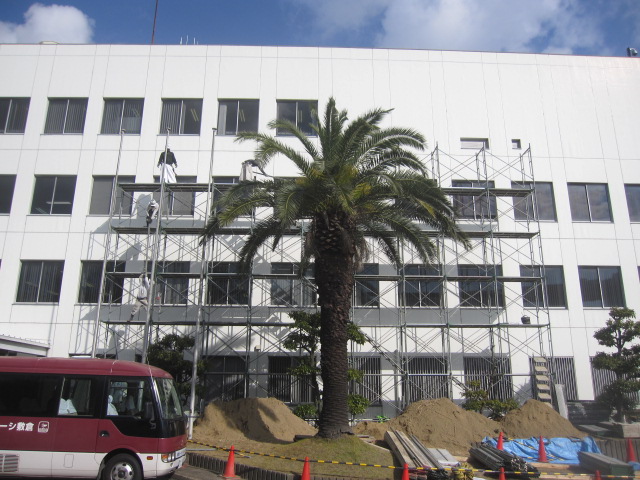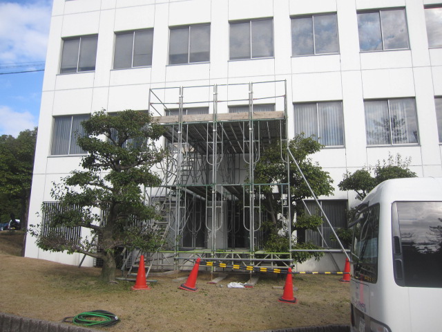 倉敷シーサイドホテル研修棟耐震補強工事 外部足場組進行中です!