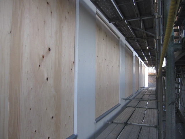 既存のサッシは工事中に資材がガラスに当たって割れたりしないようにコンパネで養生していきます。