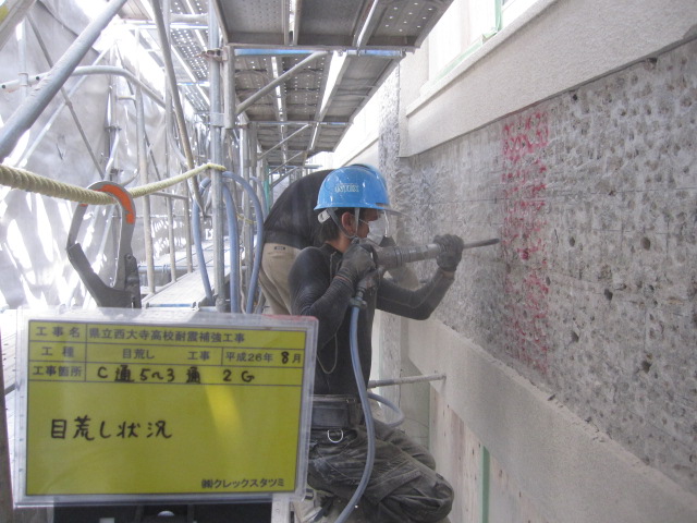 目荒らしというのは既存のコンクリートに対して新たに取り付く耐震補強構造体の付着を良くするために取り付き面を斫り凸凹にする作業のことです。