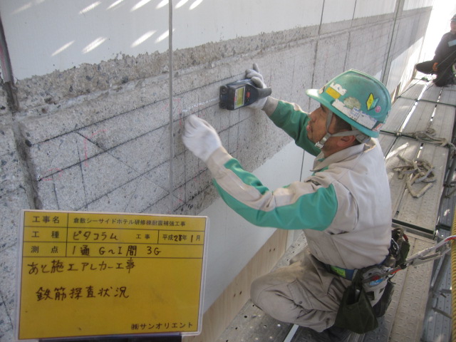 ▼これはアンカー穿孔作業の前に既存躯体の鉄筋探査を行っている状況です。