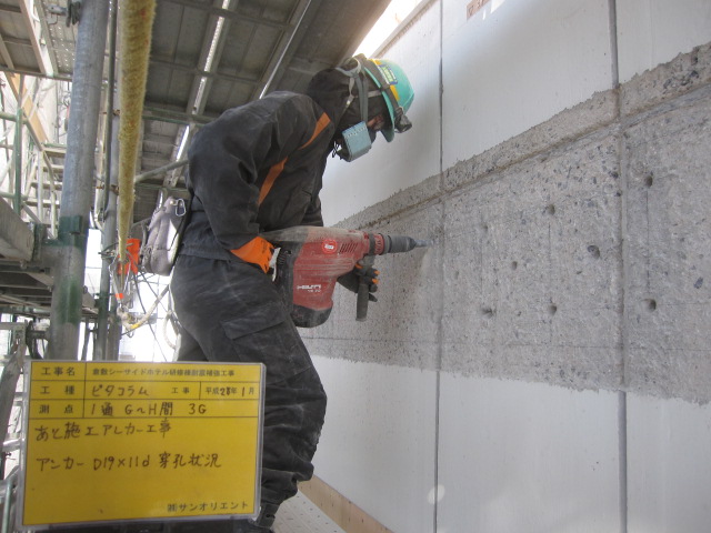 先ほどの工程で鉄筋探査を行ってだいたいの鉄筋の位置が分かるので、正規の位置に鉄筋がいた場合はアンカーピッチが規定内に収まるように位置をずらしたりしながら作業を行います。