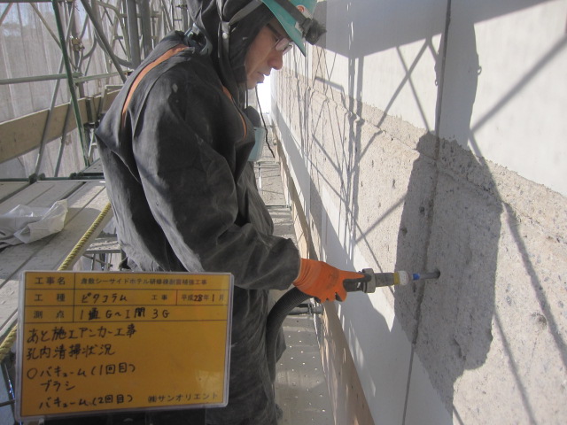 ▼穿孔が終わったら孔内の粉塵をバキュームとブラシで掃除していきます。