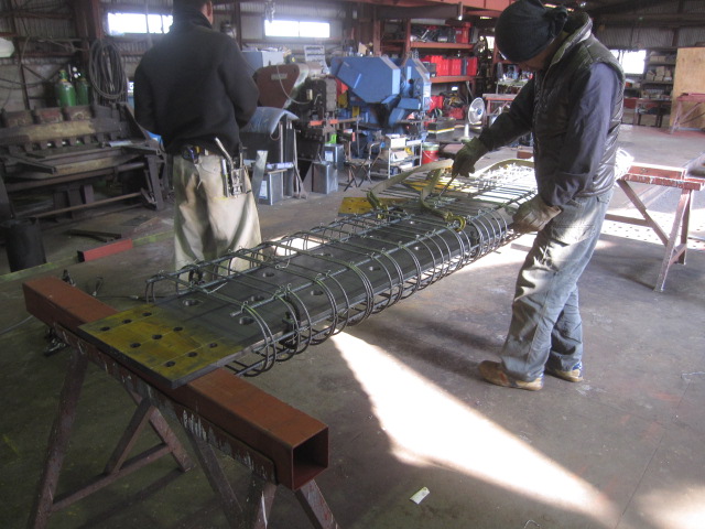 ▼そして今日はピタコラム工事の鋼板に鉄筋を巻く作業を鉄骨業者さんの工場で行っています。