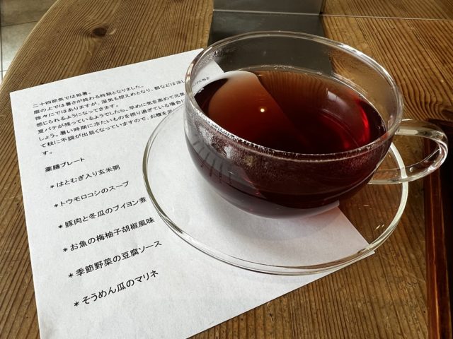 セットでついているドリンク。目の健康にいいという薬膳茶にしてみました。