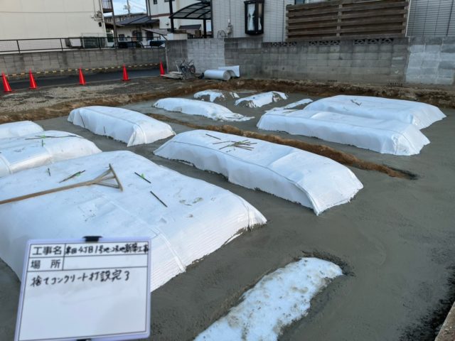 白いところは白いシートはコンクリートパッドという名前で、外部(地中)からの湿気や温度を防ぐために部屋の下となる箇所に敷いています!