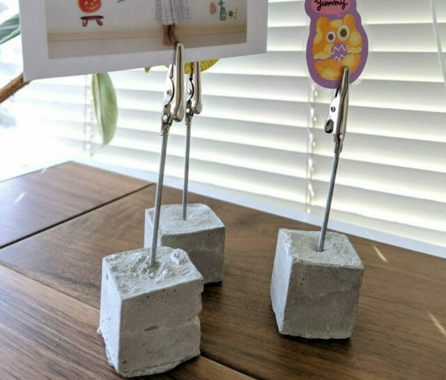 こちらは以前、HUGHUGのイベントでプレゼントしてご好評いただいた、インスタントセメントで作った社員手作りのフォトスタンドです。職人さんのようにキレイな仕上がりではありませんが、無骨感が良いということで。