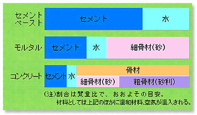 現在セメントは、そのほとんどがコンクリートとして使われていますが、図に示すようにセメントと水だけを混ぜてペースト状にしたものを 「セメントペースト」、これに砂を混ぜて状態を「モルタル」、さらに砂利や小石を骨材として加えた物が「コンクリート」です。