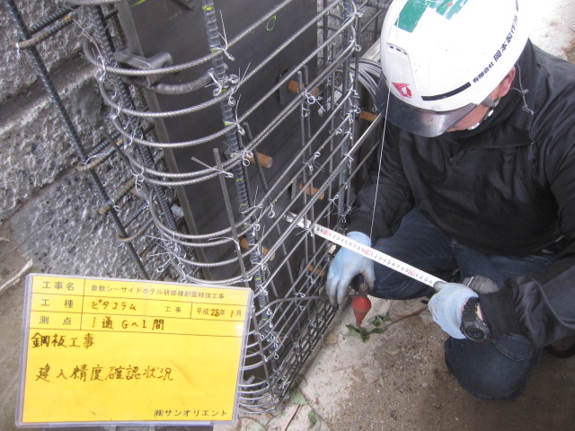 ▼鋼板が全ピース取り付いたら建て入れ調整を行っていきます!(施工誤差は3mm以内です)