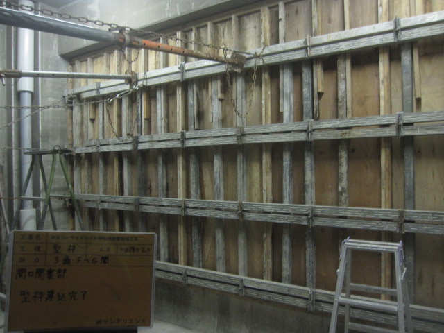 開口閉塞部の型枠は新しく鉄筋を組んだ既存の壁面を内外から挟み込むように組んで行きます!