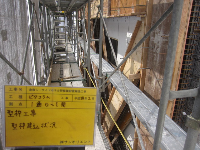 今週の倉敷シーサイドホテル研修棟の工事の状況ですが、今週からピタコラムと開口閉塞部の型枠工事がスタートしました。
