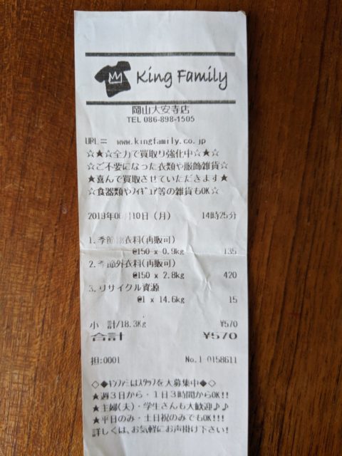 ▼私が衣装ケース3箱をキングファミリーに持ち込んだ時のレシートです。