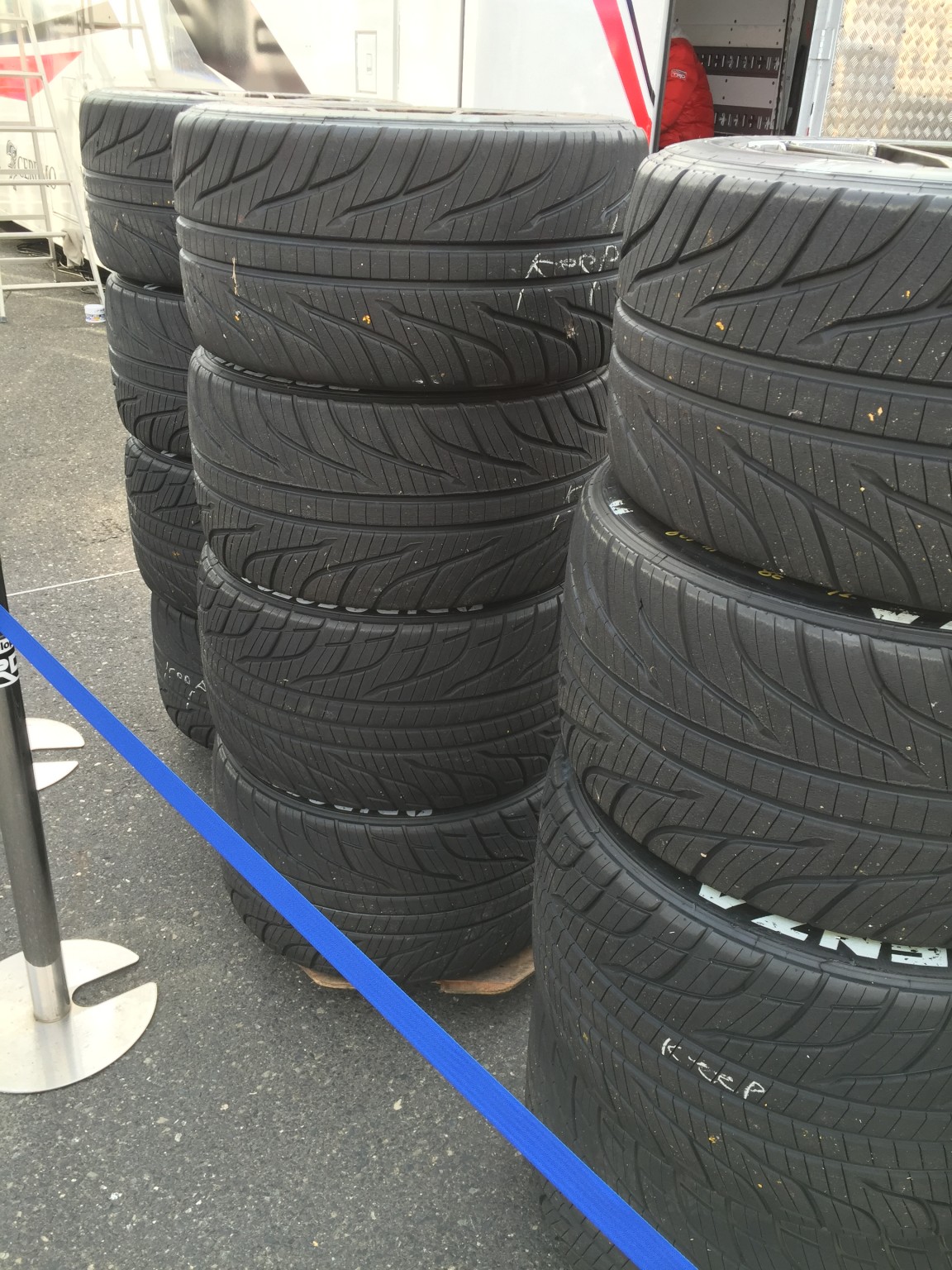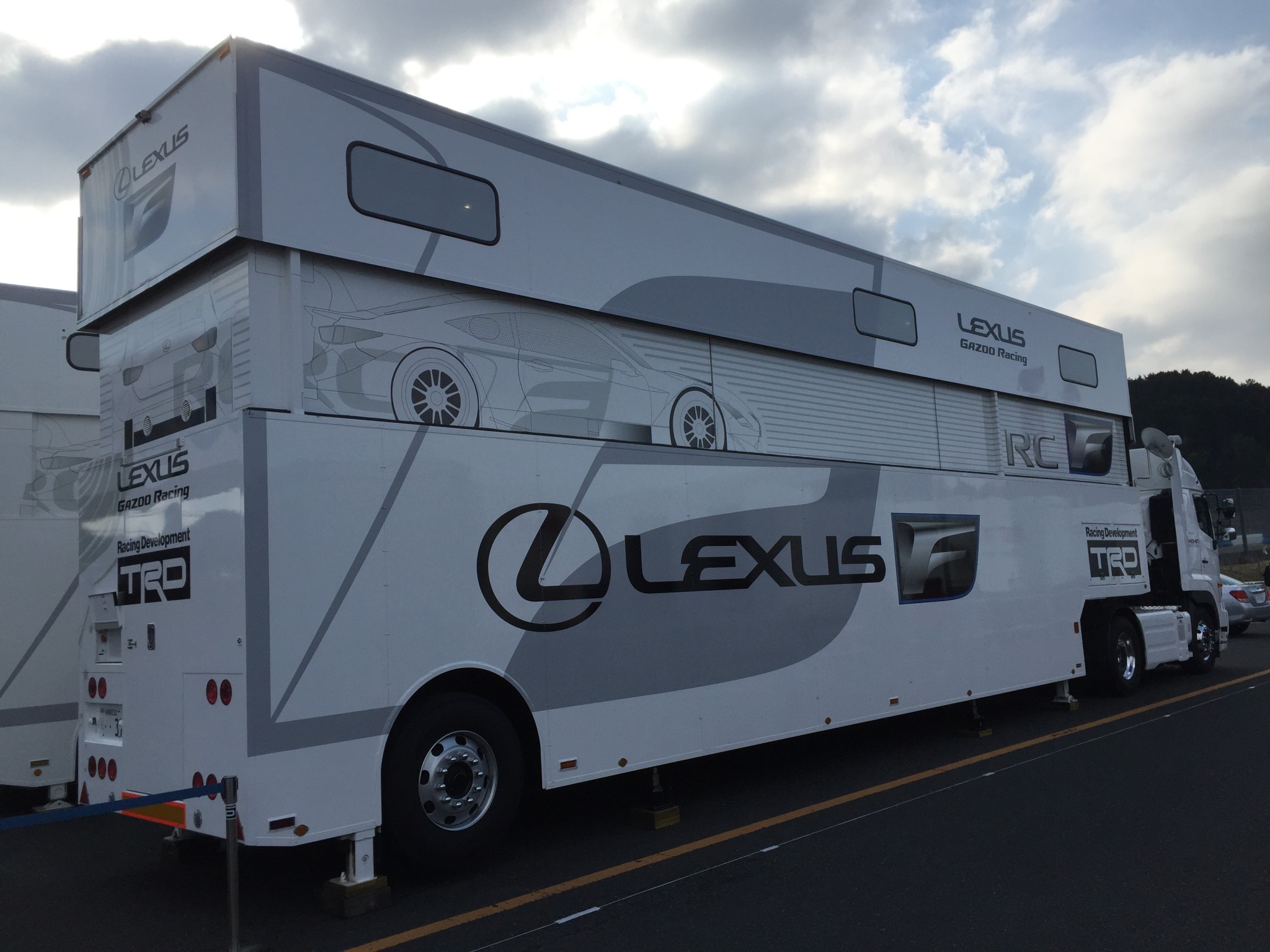 こんなトレーラーにマシンやタイヤを乗せてきます、中が事務所になったものもあります。