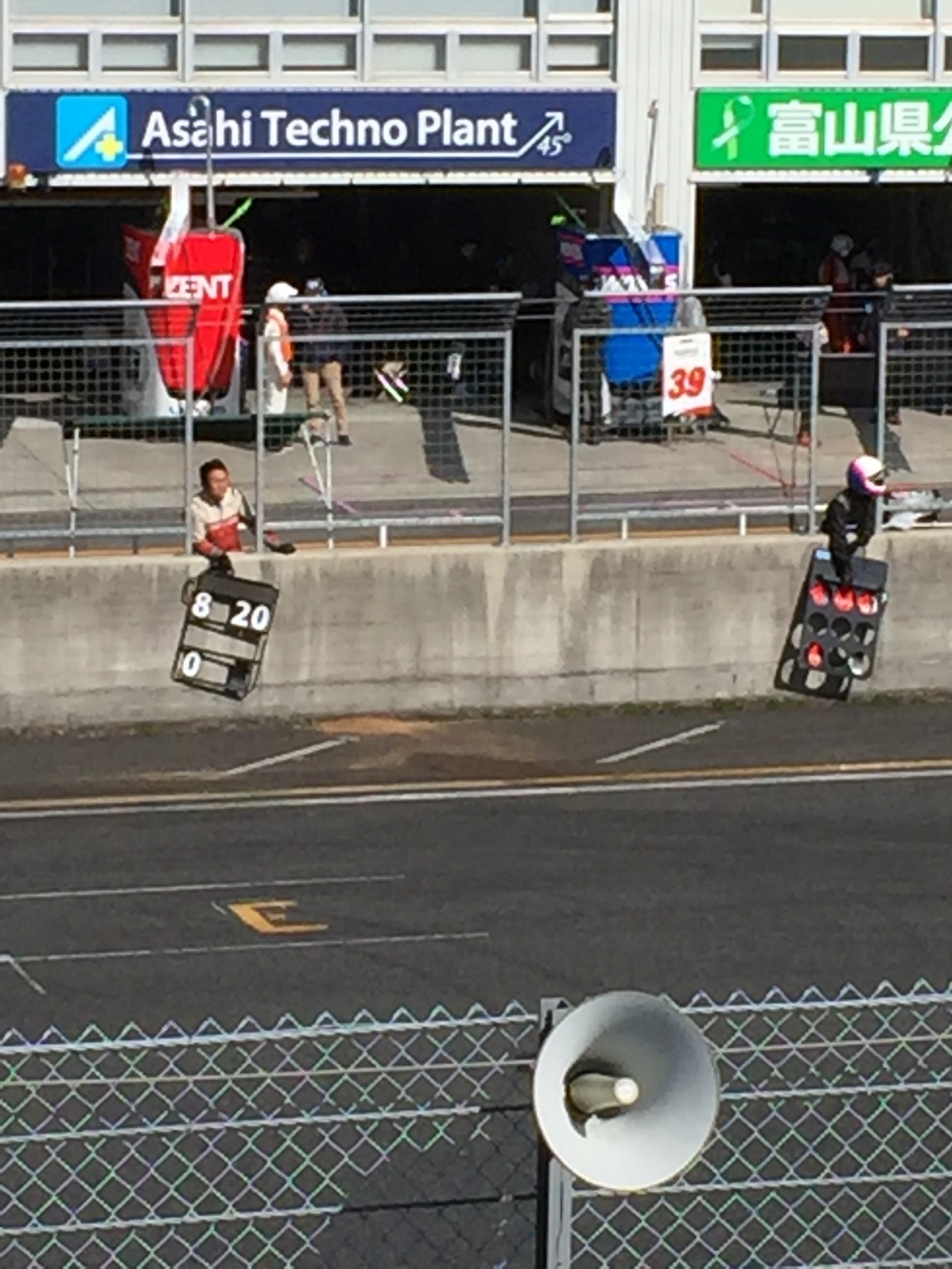 ピットサインです、マシンに無線はついていますがピット前にはボードが出され、周回数、周回タイム、順位、何時ピットに入ればよいかなどの情報が得られるようになっています。