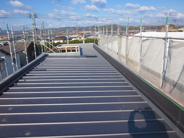 今回の屋根材はガルバリウム鋼板を使用した「立葺きワンタッチルーフ」という工法です。