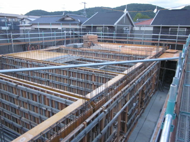壁の配筋が完了したら次は型枠を組んでいきます、墨に合わせて通りよく建込みコンクリートを打設しても型枠が壊れないよう鋼管で頑丈に締固めます。