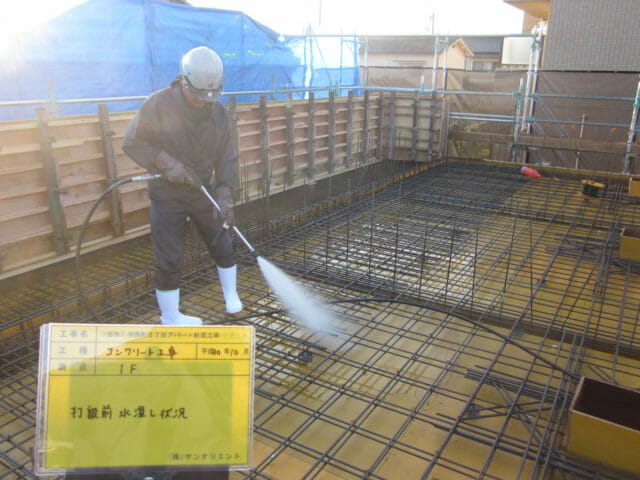 コンクリート打設当日の朝はまず型枠に散水を行い型枠の清掃と型枠に水分を含ませることでコンクリートの水分が型枠に奪われないよう湿潤状態にします。