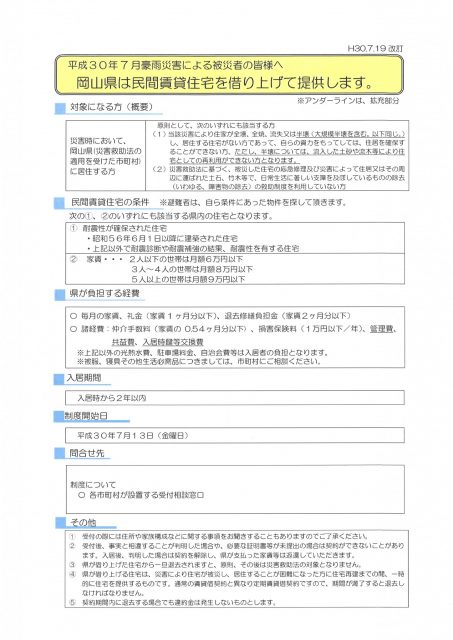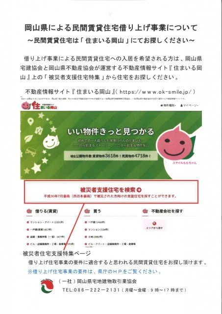 一般市場に出ている賃貸物件を岡山県が借り上げて被災者の方に仮設住宅として使って頂くという施策です。