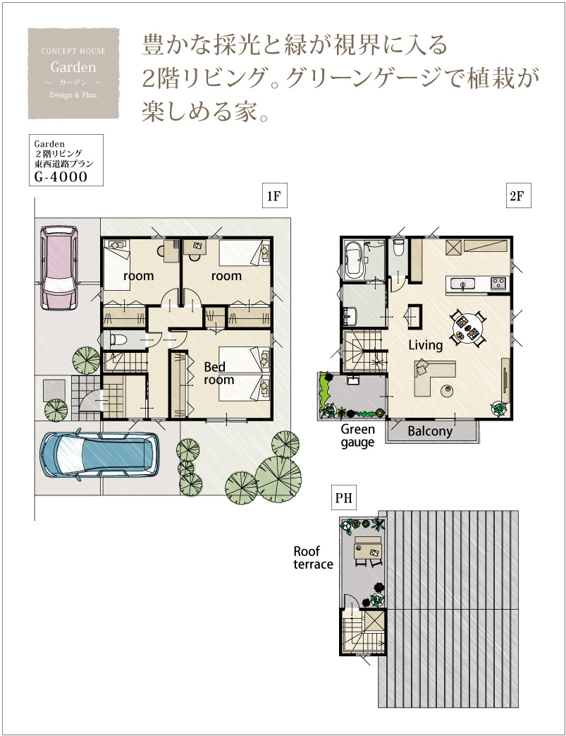 今回ご紹介する間取りプランは、豊かな採光と緑が視界に入る2階リビング。グリーンゲージで植栽が楽しめる家Garden~ガーデン~