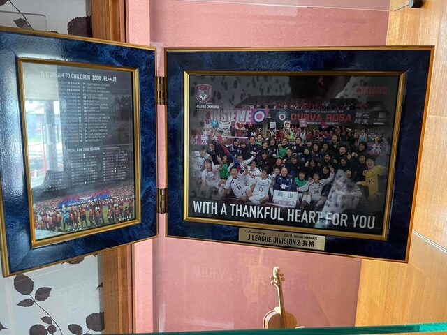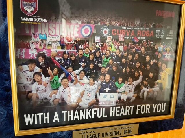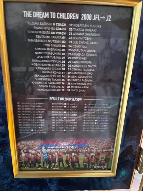 これがJ2昇格の盾です、手塚監督はじめ懐かしい選手の方々、一番前にはヴェルディから移籍してくれ、27得点、次の年も18得点しJ2昇格の立役者喜山選手(11番 現ギラヴァンツ北九州)も写っています。