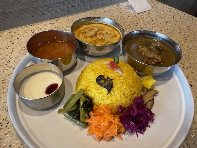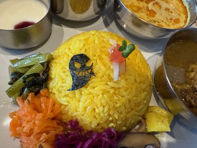 メニューはスパイスカレー中心なので私は、2種類のカレープレートを注文、カレーの種類は4種類から選べてこの日はハロウィン特別メニューの