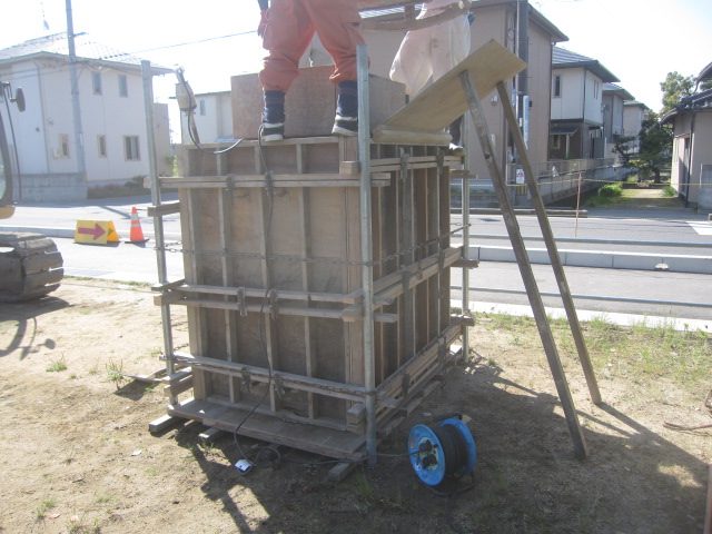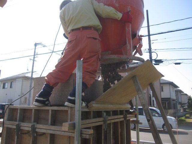 ▼次に現場で型枠の締固めを行い、重機とホッパーを使い生コンを流し込んで行きます!
