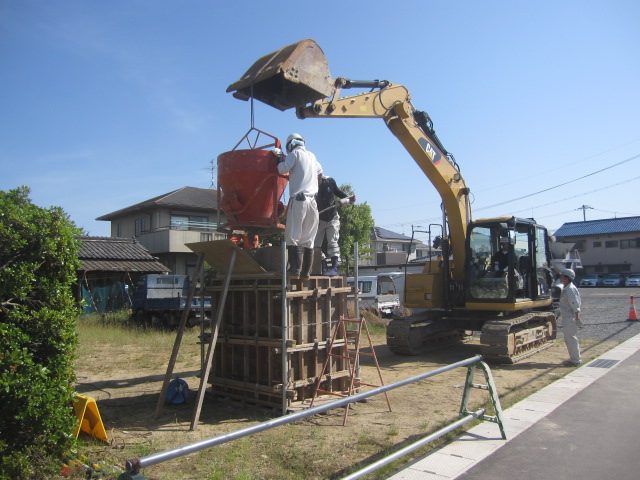 ホッパーとは写真の重機が吊り上げているオレンジ色の大きなバケツ型のもので、このホッパーは底の部分が開閉できるようになっているのでそこから生コンを流し込んでいます。