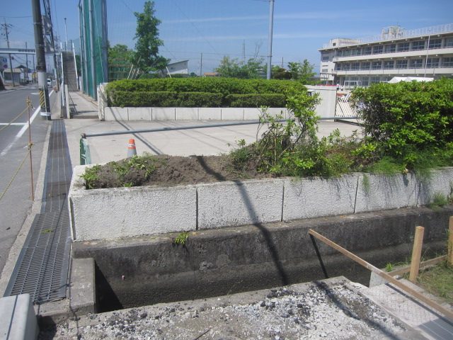 ▼その据え付け場所がコチラで写真は着工前ですが小学校の花壇と水路・擁壁の一部を取り壊します。