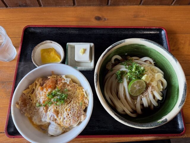 かつ丼とぶっかけ冷 のセット 豆腐とお漬物もついています。