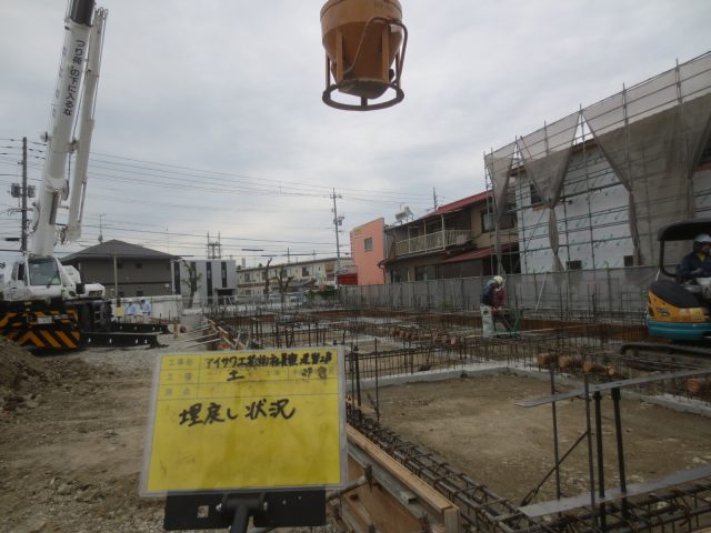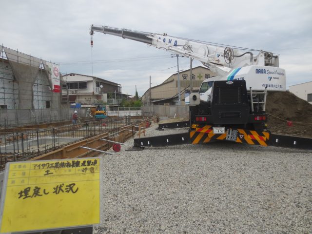 この建物は特殊で、アンカーボルトなど基礎から飛び出しているものが多い為、ダンプやショベルカーが基礎内に入れない為、クレーンによる埋戻しを行いました、思ったよりスムーズに埋戻しが行え土工さんに感謝です。