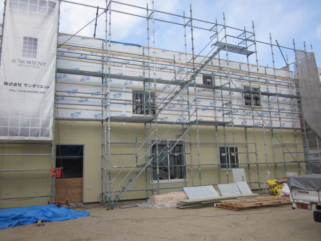 木造の部分の組上がりが終わりサッシが着きますといよいよ外壁を貼っていきます。