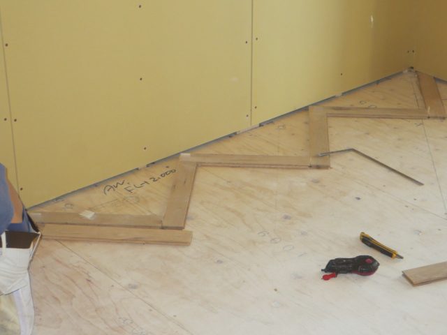 貼り方にも色々と方法があり、今回は2Fが乱貼り、1Fはヘリーンボーン貼とし、仕上げにはオスモカラーで着色します。