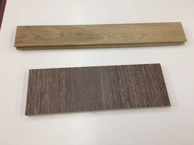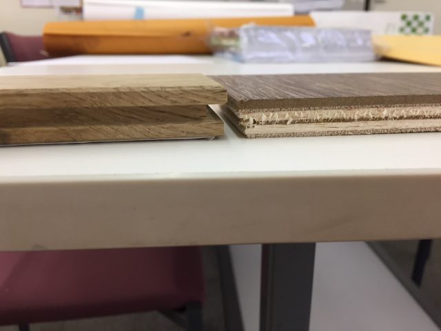 新建材のフローリングでは表面に薄い板(単板)を貼った物や、木目の柄を印刷してある物もあります。