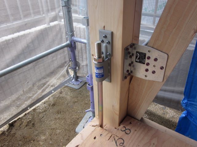 こちらはホールダウン金物と言って主に通し柱部分に付く金物で地震や台風時に土台から柱が抜けることを防ぐのに必要不可欠な金物です。