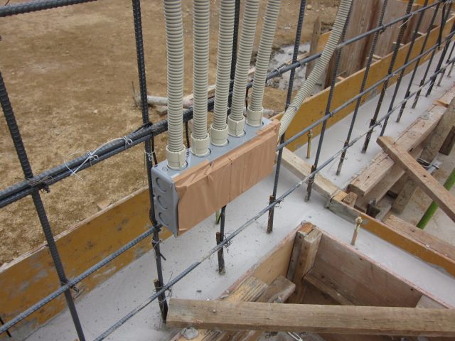 コンクリートの壁は木造の壁のように内部に空間がないのでコンクリートを打設する前にボックス・配管を仕込んでおき後からその配管に線を通して配線していきます。