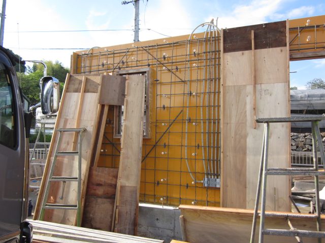 前回ブログでは打ち放しRC壁の配筋までが終わり次の工程は型枠の建て込みに入っていきますがその前に電気屋さんがRC壁内部にコンセントのボックスや配管を仕込んでおきます。