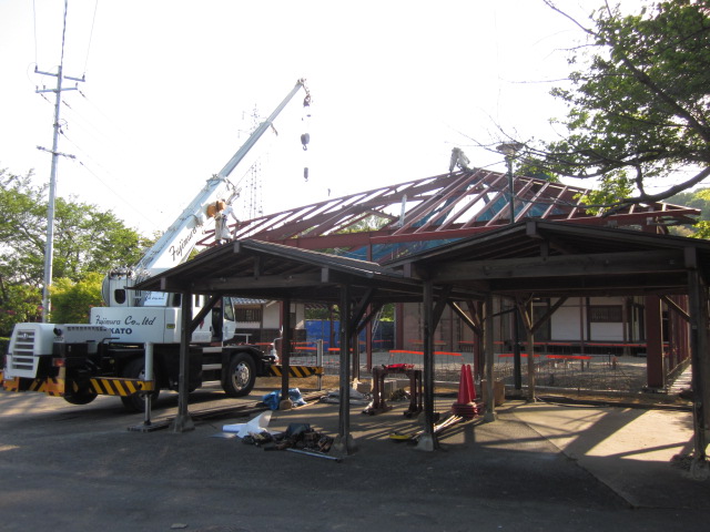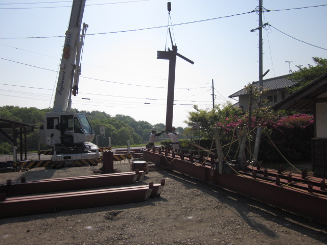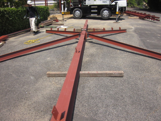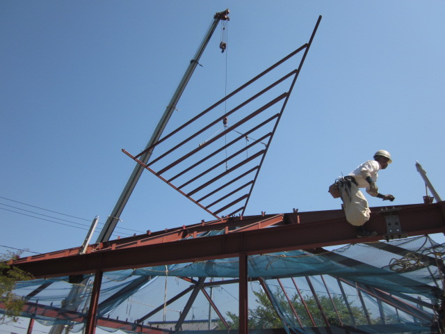 斜めの屋根面の部材のつなぎ合わせはとかく難しいので極力地上で地組をして吊り上げます。