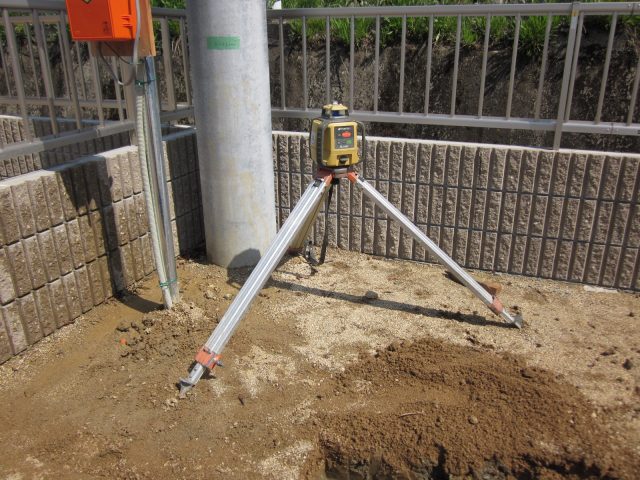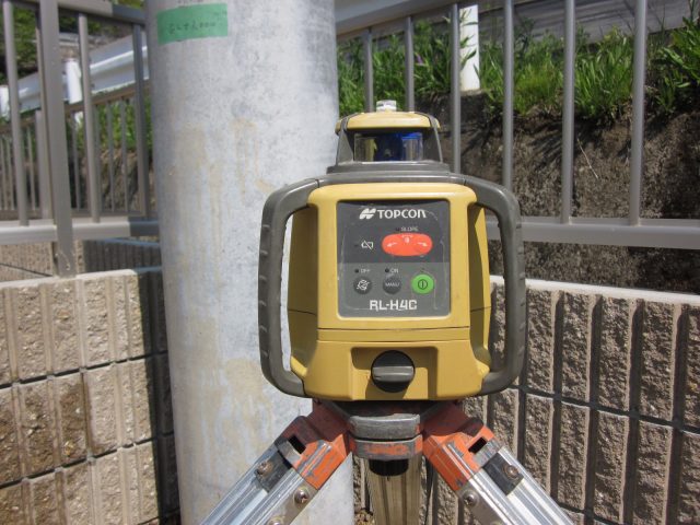 この測量機器は上部のヘッド部分からレーザーが出ており受光器をその高さに合わせるとピピッと音が鳴るようになっています、出したい高さに合わせて受光器をスタッフと呼ばれる測量道具に固定して上げ下げするだけで高さ確認ができる優れものです![]()