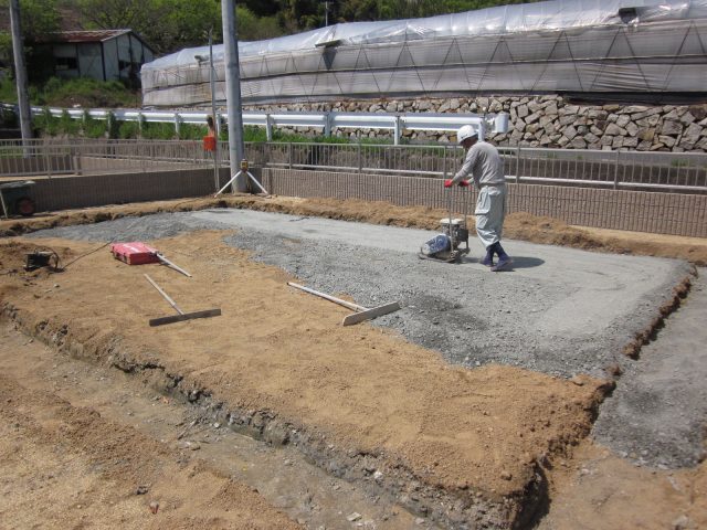 砕石は基礎コンクリート部分の下の層で沈下等が起こらないようプレートという機械で叩きしっかり転圧していきます!