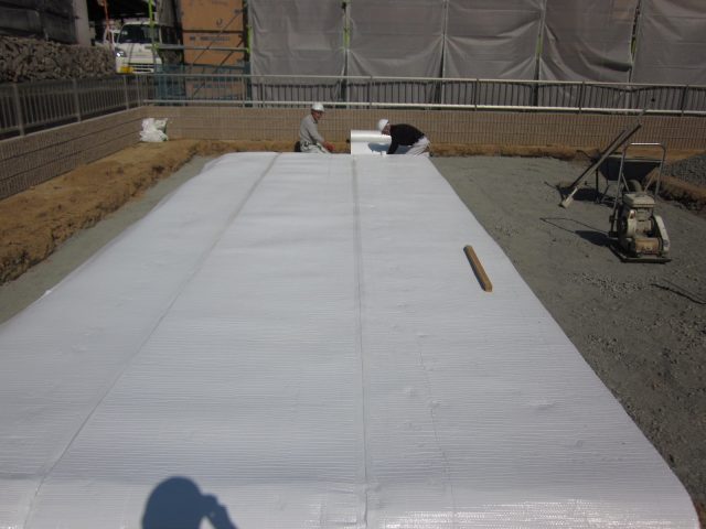 砕石敷きが完了後、コンクリートパッドという当社が標準仕様としている遮熱シートを敷きこんでいきます、この遮熱シートによって遮熱と地盤からの湿気を遮断します!