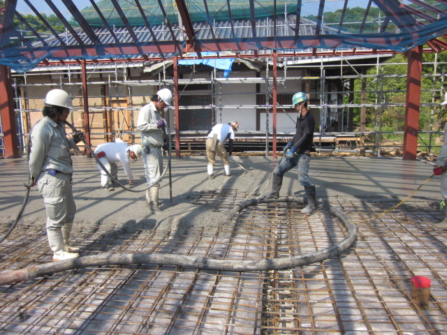 連休あけの天候が不調でなかなか読めない中、かねてから予定していた日が抜群の好天に恵まれるというラッキーに恵まれ、土間コンクリートを打設しました。