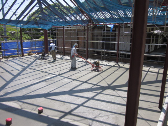 コンクリートのレベルを確認しながら打設をしていき、打設終わりから2時間くらいしてある程度固まってきたところで機械とコテを使って表面をしっかり押さえていきます。
