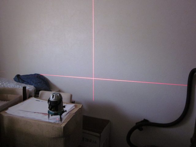真っ直ぐ据えて電源を入れたら写真のように縦・横に水平・垂直のレーザーラインが出るのでそれを基準に墨出しや水平・垂直の確認が行えます。