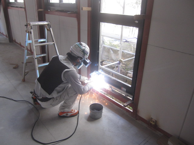 アルミサッシの取付状況です、基準の墨から高さや出入りを微調整してくさびで仮固定し鉄骨アングルにサッシを溶接で留めていきます。